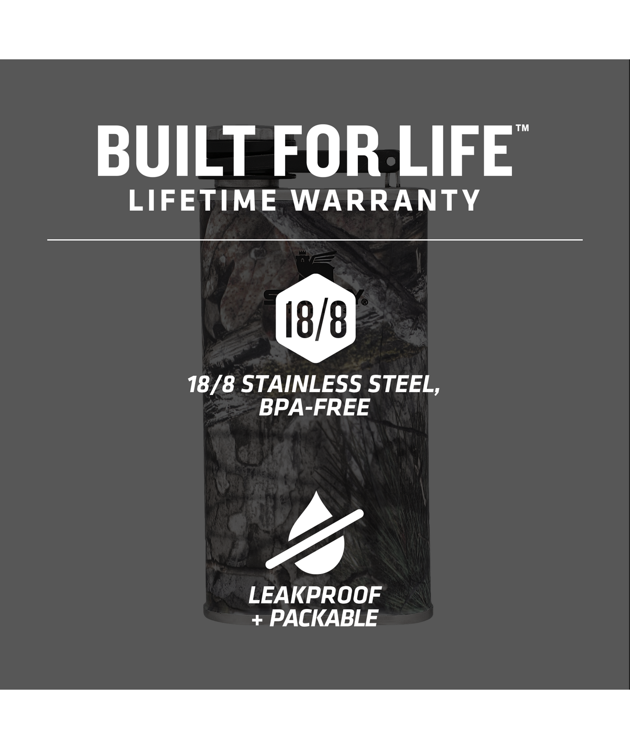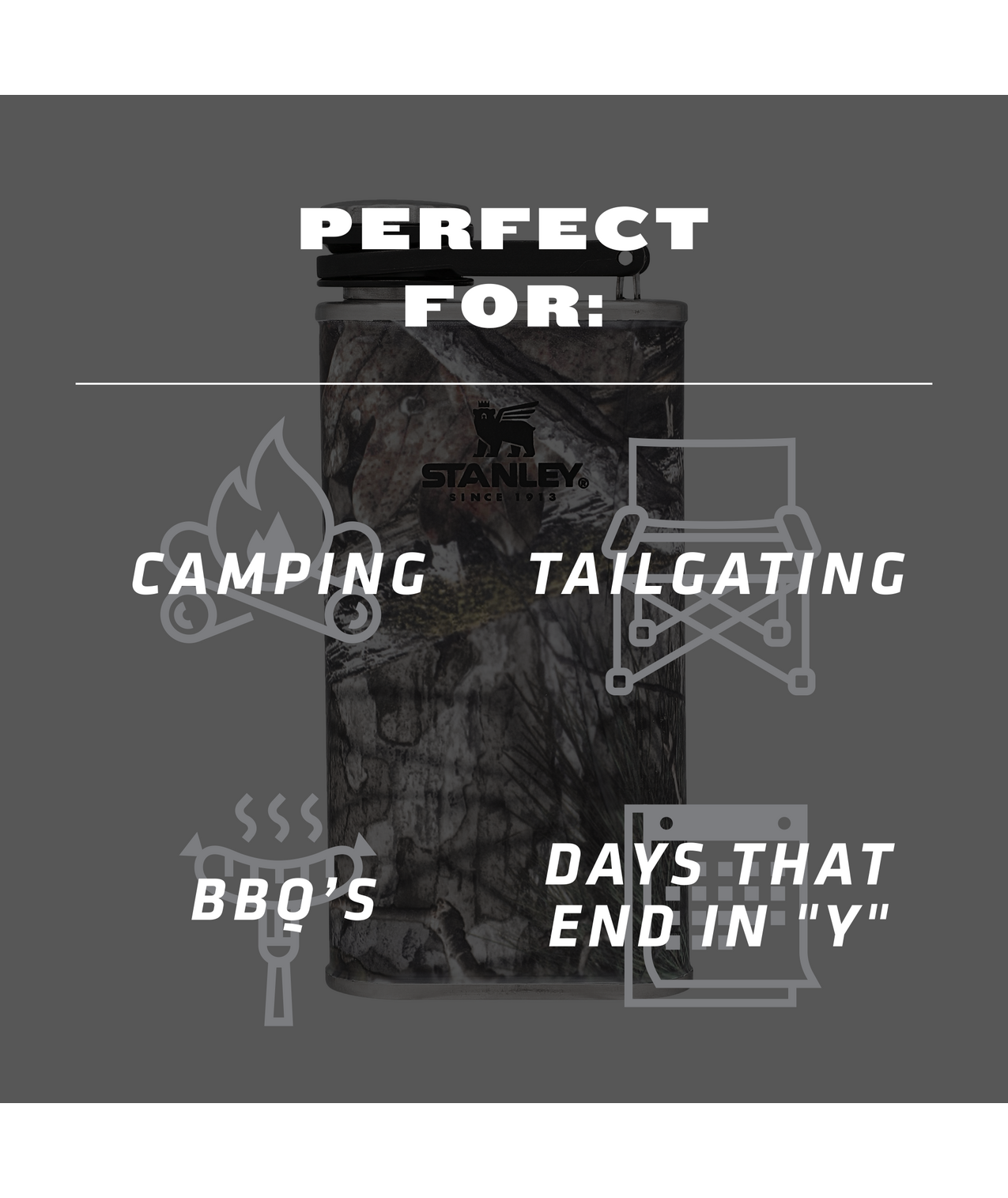 After a long day in your hunting blind or fishing boat, it’s time to celebrate. Stanley and Mossy Oak® have you covered with the “Camo Flask” in classic Mossy Oak® print. Constructed of durable stainless steel, the portable size is made for slipping into a pack or pocket, and the wide mouth makes for easy filling. No funnel needed. Last but not least, there’s a never-lose cap.