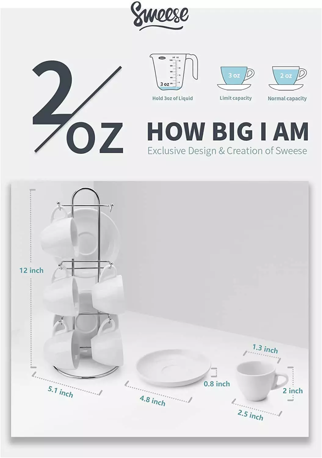 - Each espresso shot cup holds 2oz (without filling it to the very top).