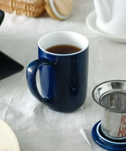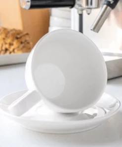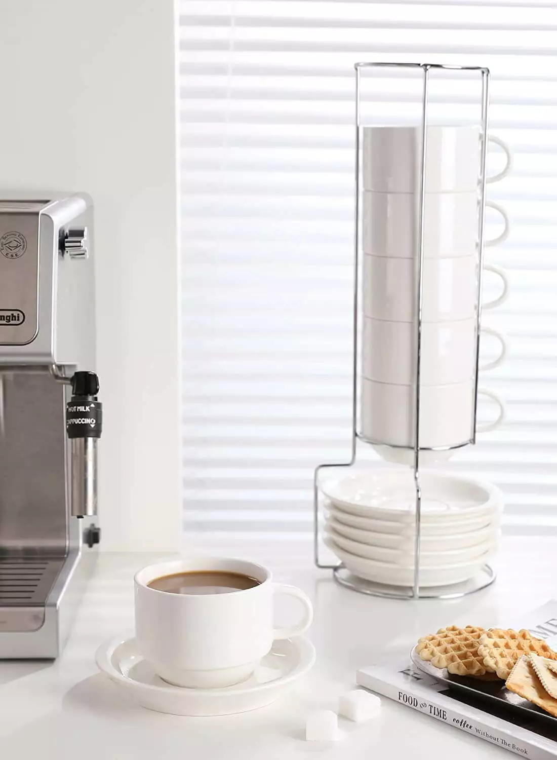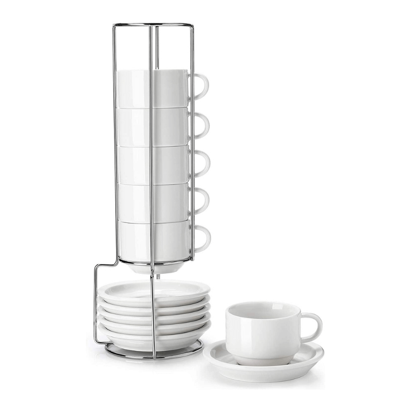 - Porcelain cup/saucer set with a stacking stand to keep the set together