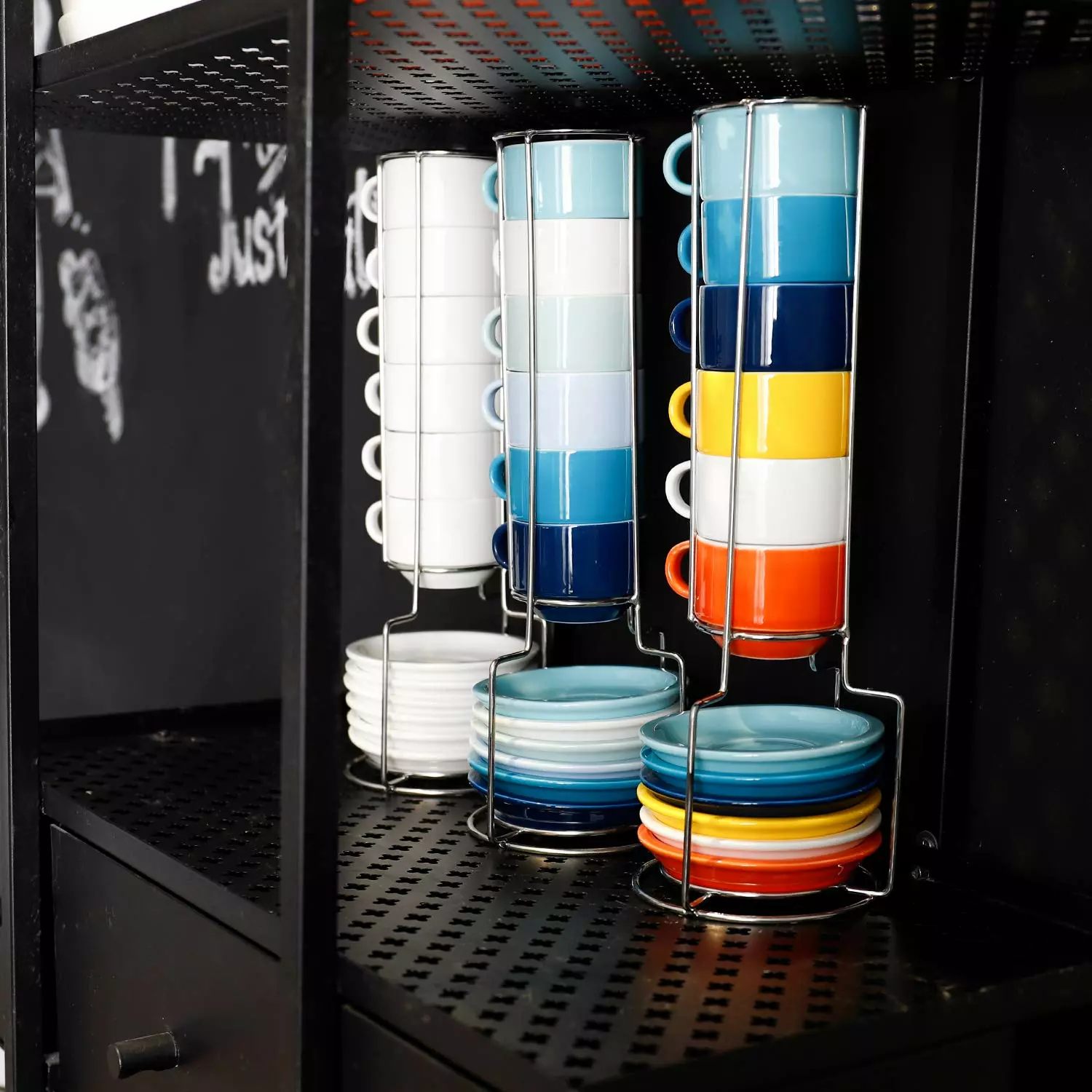 A Simple yet classy design that perfectly fits your espresso maker. Coming with Saucers and the great stacking stand. The walls of the cups are relatively thick, so they retain heat. They have a cafe look that actually makes you feel as though you are in a coffee bar enjoying your brew.