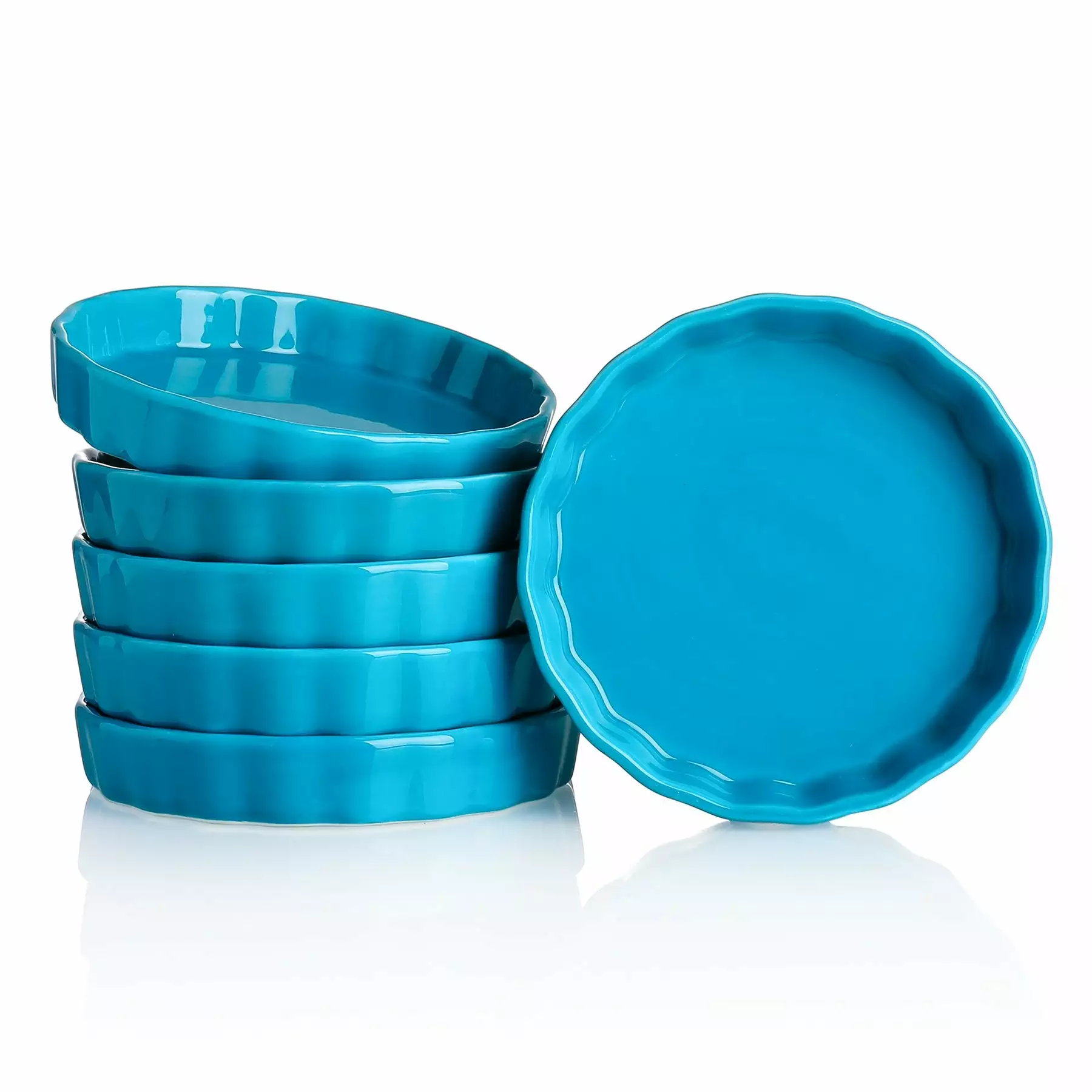 The Sweese ramekins are a nice size for individual fruit tarts, or other desserts, sides, etc. The shape of the ramekins is consistent (they stack well in a drawer), the glaze is even and appears it will hold up well. They are oven safe and will work for anything – dessert or entre.