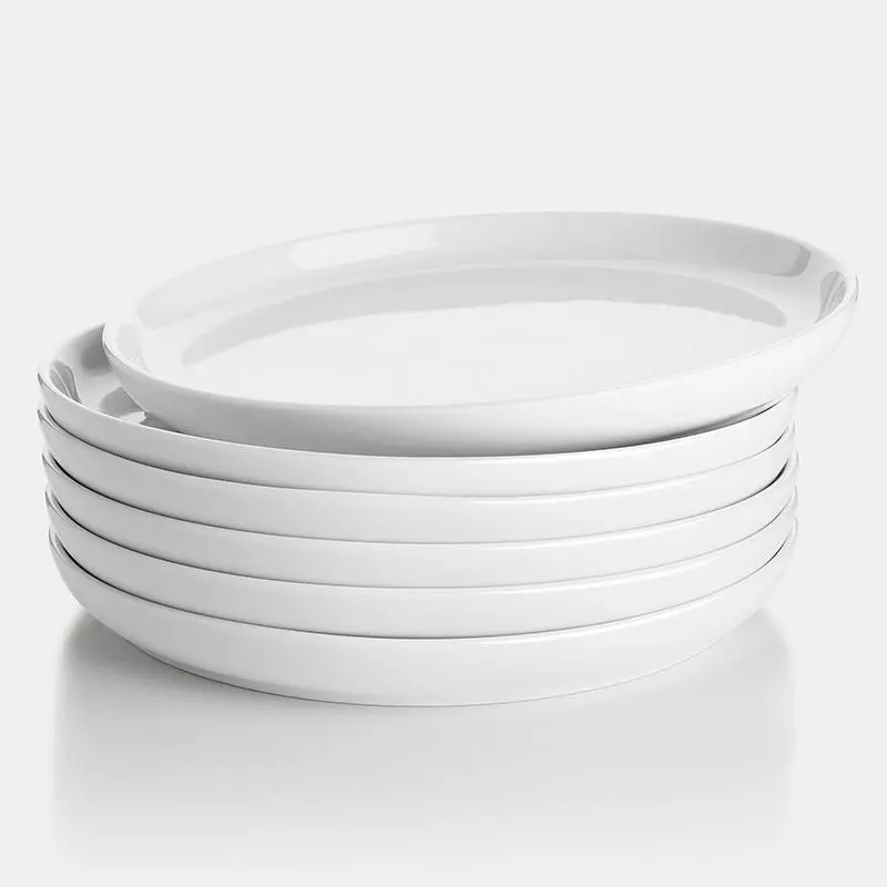 The minimalist round design and the classic white color make the dinner plates appealing to the eye. These classic and gorgeous dinner plates look stylish on the table. The pristine white fits all decorations and is a timeless classic. Ideal for main course like pasta and steak, salad, sandwiches and more. These dinner plates have a lip all around the edge to prevent food runaway.