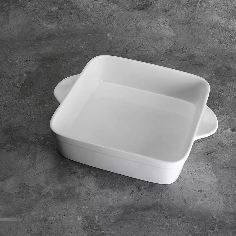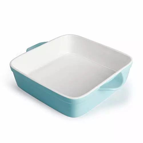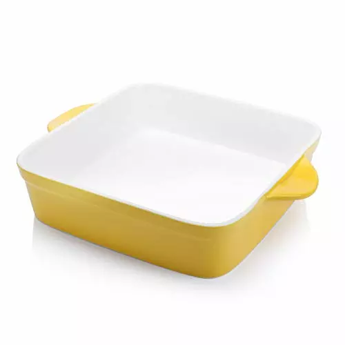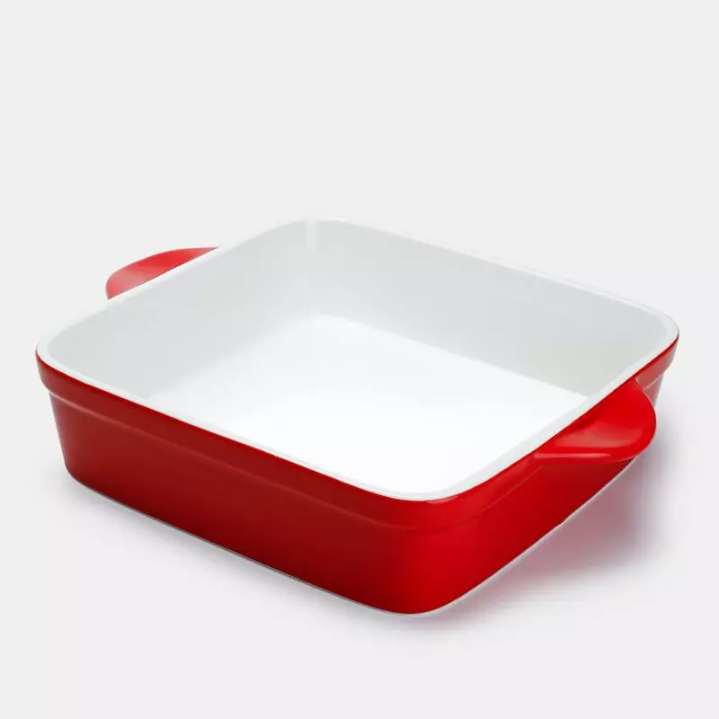 The baking dishes in durable porcelain is glazed in various lively colors and tall-sided with convenient handles. These pans remain durable, easily transitioning from microwave and oven to table, and are safe for use in dishwasher.