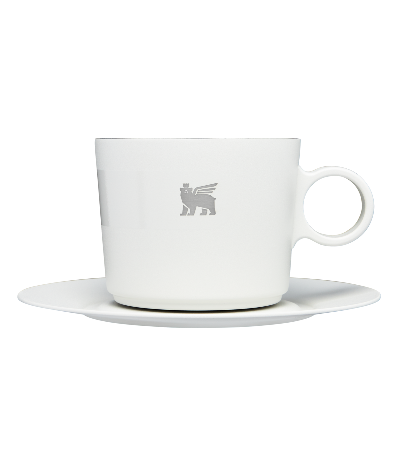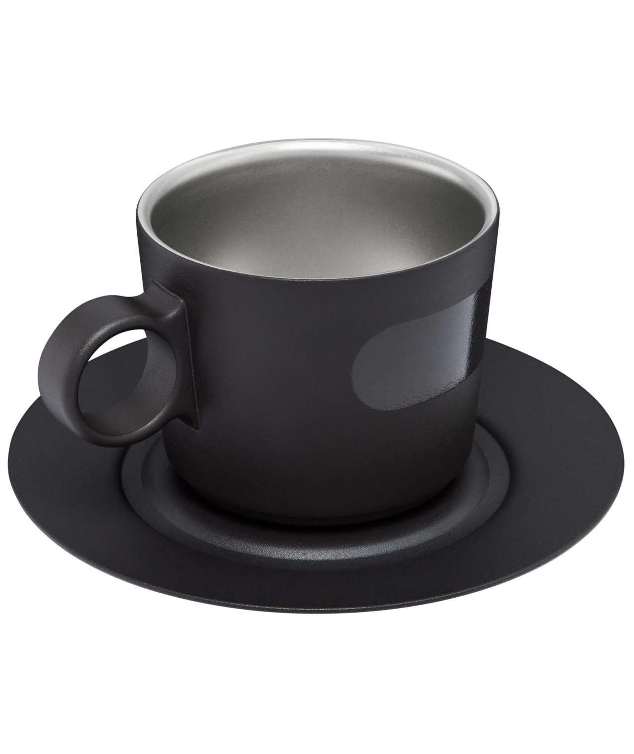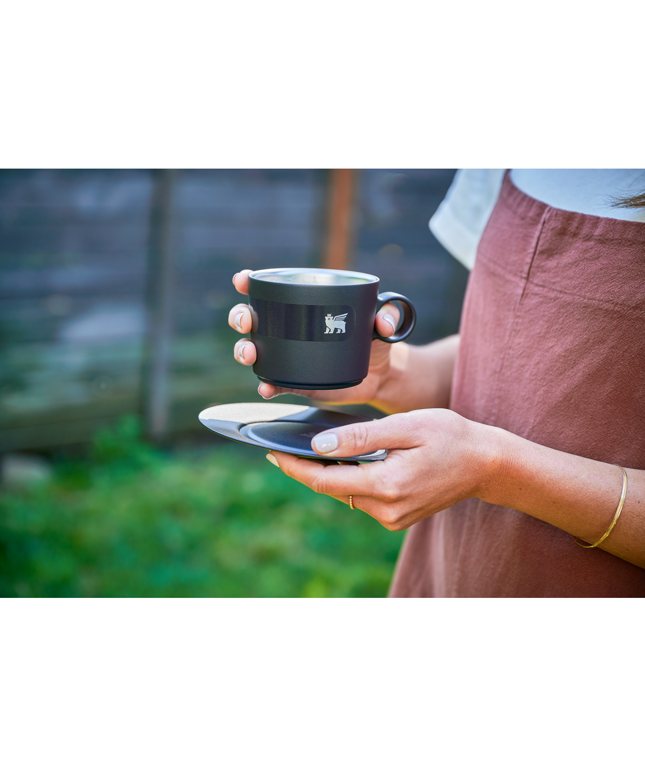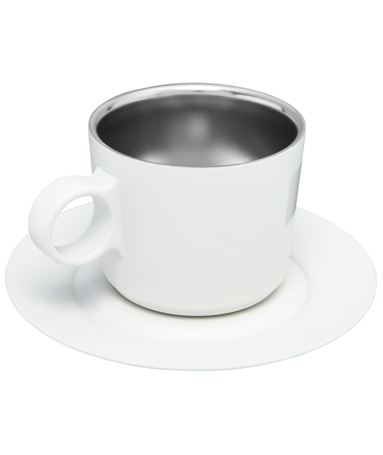 For added peace and quiet, both the cup and saucer feature a sound-softening, non-slip silicone base. The cup’s circular handle is designed for comfortable sipping while the double-wall vacuum insulation keeps your favorite hot beverage at the ideal temperature. The Stillness Saucer also gives you room for a spoon and biscotti.